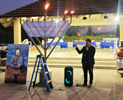 As sunset waned, Rabbi Mendy Grossbaum invited dignitaries State Senator Anthony Portantino, La Cañada mayor pro tem Keith Eich, CV Town Council President Harry Leon and GCC Board of Trustees member Ann Ransford to help light the shammash – the center candle from which all the other candles are lit on the menorah.