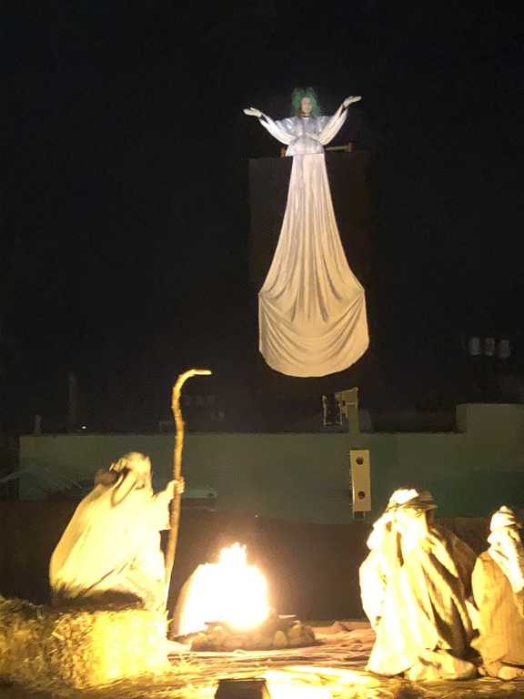 In the first scene, Mary and Joseph are journeying to Bethlehem following the decree by Caesar Augustus that a census was to be taken and citizens were to return to their towns of birth. In the second, an angel appears high above the shepherds proclaiming the good news of Christ’s birth. The third scene is of Jesus’ birth in a stable and finally we see the Wise Men as they make their way to find the newborn king.
