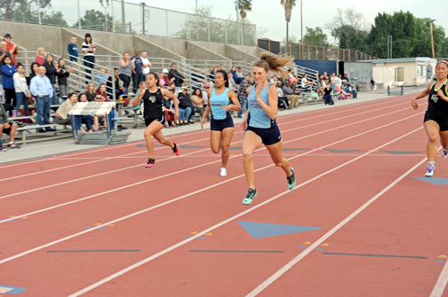 Senior Grace McAuley scored a valuable dual win in the 1600 and 3200 races. Winning with a PR mark of 5:33.8 in the 1600, McAuley also won the 3200 (12.28) and ran the 4 x 1600 relay. Falcon junior Jennifer Saengsri took home first in the 100HH (16.9) and placed an important third in 300LH (51.9).