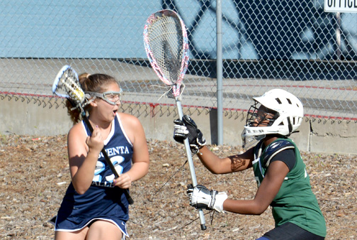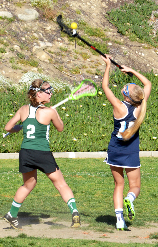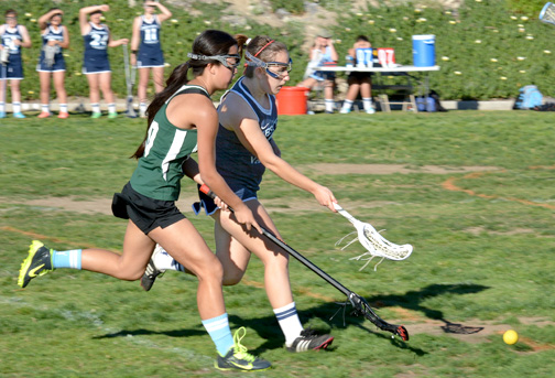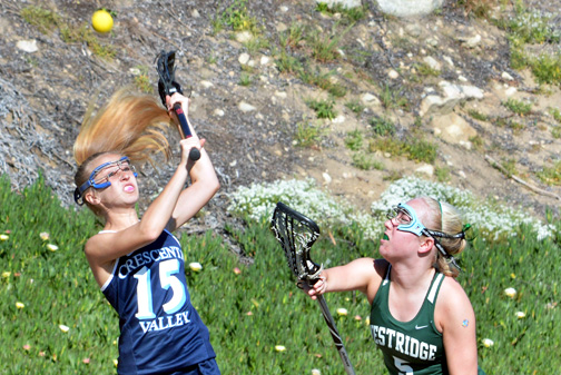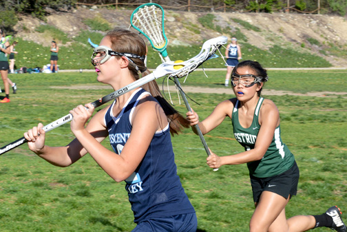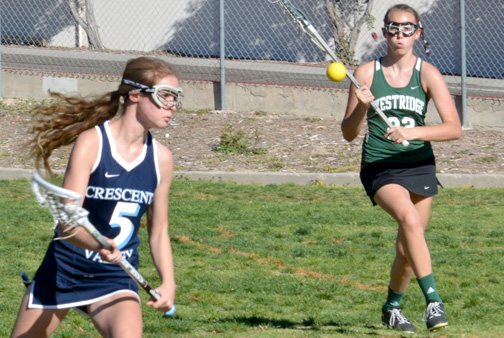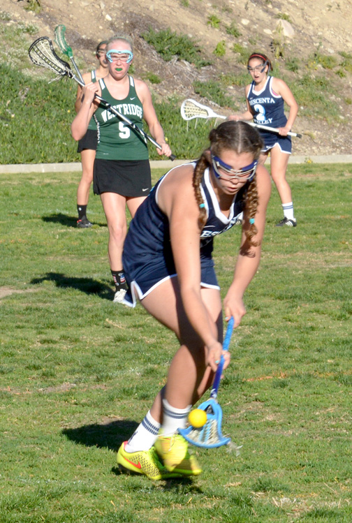Leah Crowther fights for a ball against Westridge on March 12. She assisted on CV’s first goal of the game and scored two goals in the 8-7 win.