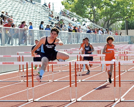Burroughs’ lead distance runner Anthony Monroy had a dual win both in the 1600m (4:22) and 3200m (9:46) with Falcon Gabe Collison running the lead in the 3200m during most of the race. Nick Beatty took second in the 1600m (4:31.06) with Aaron Esparza placing third (4:32).
