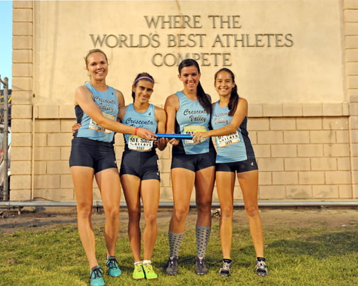 The girls’ 4 x 1600m was the last event for the CV runners. Rival Arcadia Apache team of Madison Ross, Holy Lung, Meghan Kamae and anchor Roni Yamane proved to be a major opponent for the Falcons’ team of Erika Johnson, Haley Witzeman, Rebecca Mencia and Melnyk. Johnson, Witzeman and Mencia ran their legs strongly to give anchor Melnyk a slight lead over the Apaches. Witzeman ran a personal best time, as did teammate Mencia who handed the baton off to Melnyk.