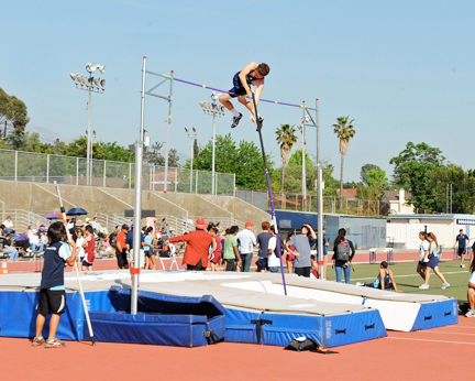 That strength was apparent with a personal dual win in the 200m (25.3) and the 400m dash (58.9). Carrillo also anchored the 4×100 relay, which CV won due to Arcadia stepping out of their zone for the baton exchange. Falcons teammate Claudia Sepulveda also put some points on the board, winning both the 100 hurdles (12.7) and 300H (46.7). CV’s Emmie Walker had a personal best high jump (5-2) winning with Emily Beglarian taking second (5-0).