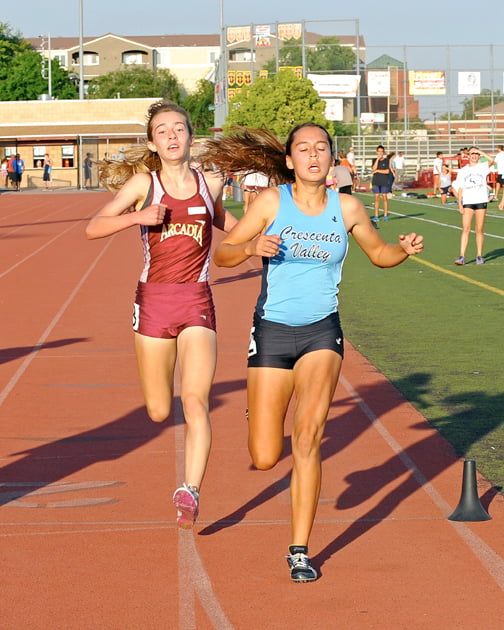 In the 800m, sophomore Melnyk won (2:19.36) in an all out race against Arcadia Apaches Glindyll Mancia who placed second (2:21.23) followed by Falcon Ruby (2:23.95).