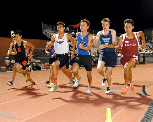 Nick Beatty captured second in the 1600 with a personal best time of 4:21.27 behind Arcadia Philip Rocha (4:20.15) and ahead of Hoover’s Kenneth Trejo (4:23.44). Beatty returned later to win the 800m (1:58.12) in front of Burbank’s Arsen Mkrtchyan in second (1:58.69) and Falcon Matt Manalo in third (1:59.41).