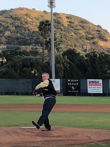 Keith Hobbs, Chief Executive Officer of USC Verdugo Hills Hospital, threw out the first pitch at Youth Night at Stengel Field on April 27. The game was sponsored by USC Verdugo Hills Hospital and held Stengel Field. The CV Falcons hosted Burroughs High. The Falcons won the game 4-1.