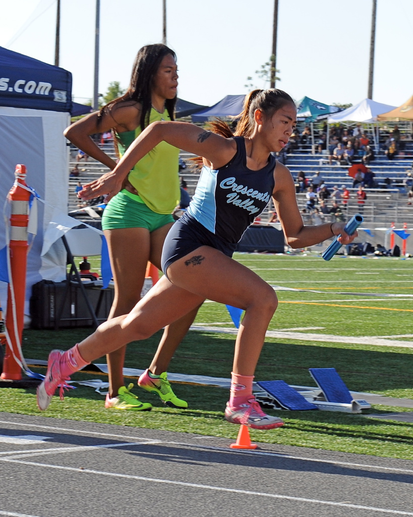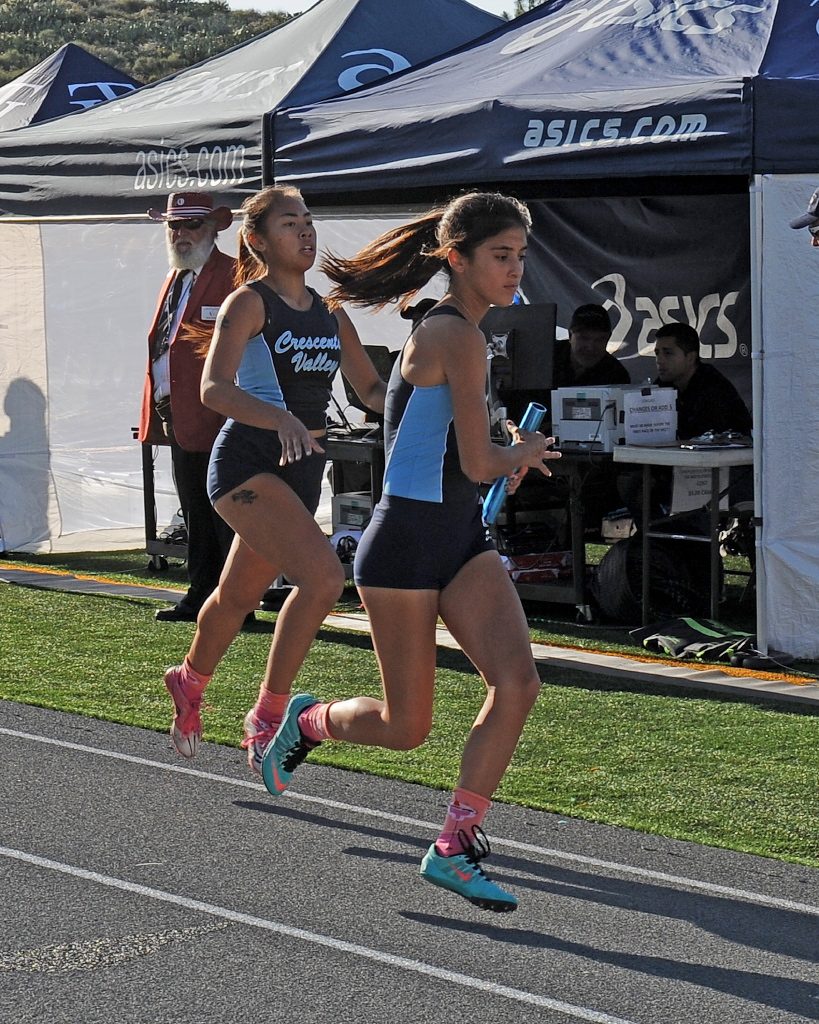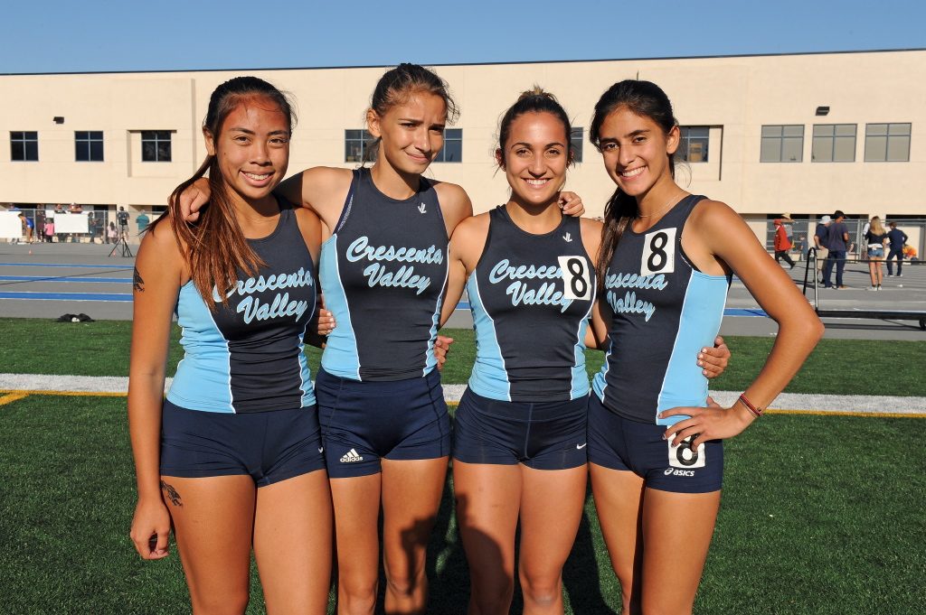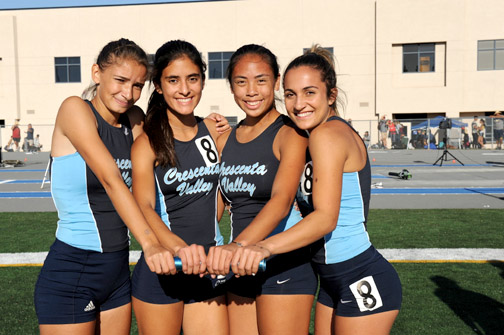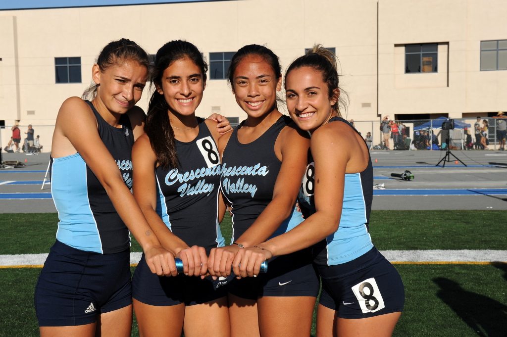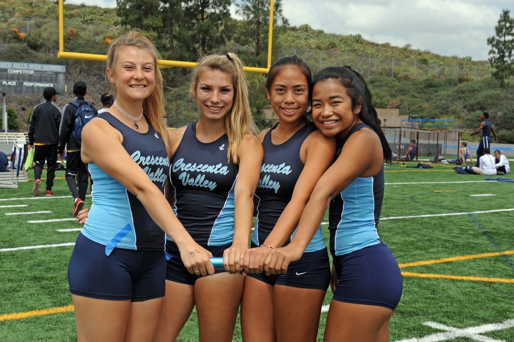 CVs 4×400 relay race member from left Izzy Liberman, Kristina Carrillo, Jennifer Saengsri, and Jade Winicki