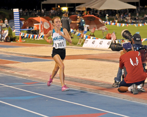 From Malibu, star distance runner sophomore Claudia Lane elected to only run one race – the 3200m at state. As the challengers were deep in strength, Lane did what she has done many times before – set the pace to her liking. Getting out strong and away from the pack, she continued to move farther away from the other runners, finishing 12 seconds ahead of the others. Finalizing a winning time of 10-07.33, she also posted two near equal 1600m times, 5-03.6 and 5:03.8.