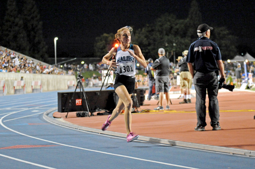 San Luis Obispo’s Callum Bolger did the impossible in his 3200m race, coming from behind and posting a time of 8:53.91 to win against a very strong field. Blasting off his final lap as the announcer shouted out 55.7, he passed favorites Copper Teare of St. Joseph and Great Oaks Cole Spencer. Luis Grijalva of Armijo High School, who won the state cross-country title this year and clocked a winning time of 4:08.62 earlier in the evening in the 1600m, tried to make his move at the same time as his competitor, but was out distanced at the finish line to post a final time of 8:54.65 to take second place.