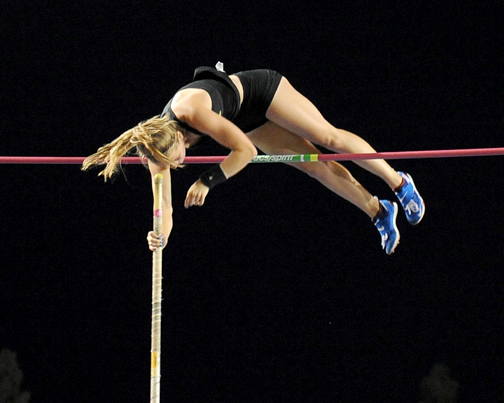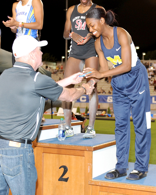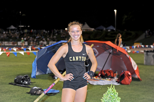 Pole-vaulter Rachel Baxter, a senior from Canyon of Anaheim, bedazzled the audience when she cleared a height of 14 feet and twice barely missed the 14-05 mark. Redondo pole vaulter, senior Tate Curran who has won most of the meets this year and has vaulted 17 feet, squeezed off a 16-10 jump to clinch the state title.