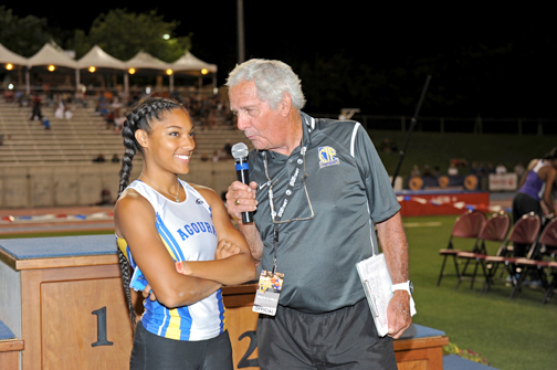 From Agoura High, Tara Davis single-handedly scored three medals with top performances in the 100m hurdles running a wind-aided time of 12.83, the fastest time ever for a high school runner. She also set a new state record in the long jump (22.01.00), breaking Marion Jones’ 1993 record of 22-0.50. In a wind-aided jump that could not be counted for the record she also posted a 22-01.25 mark. Lastly, with only two jumps, concluded her gold mark of 43.04.00 in the triple jump. Her executions demonstrated her grace and poise and she stands as one of the greatest high school athletes ever.