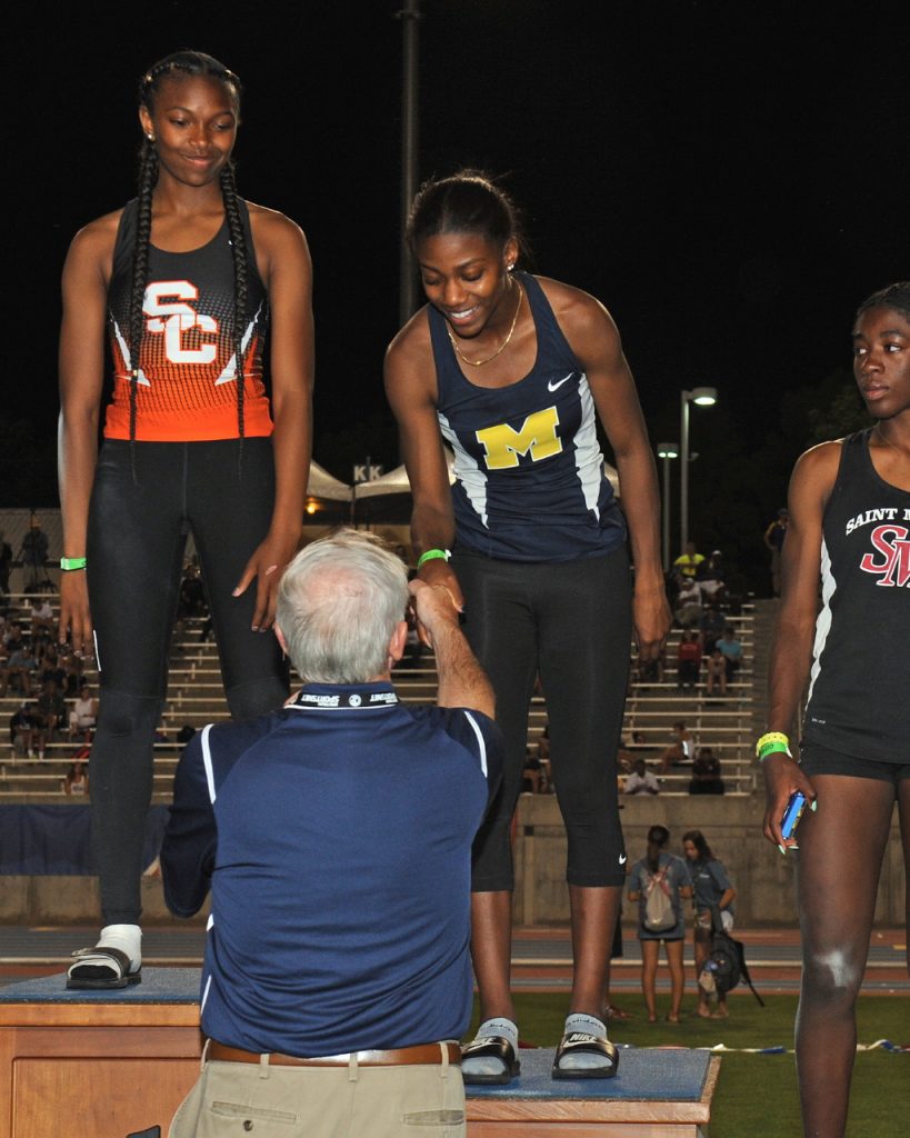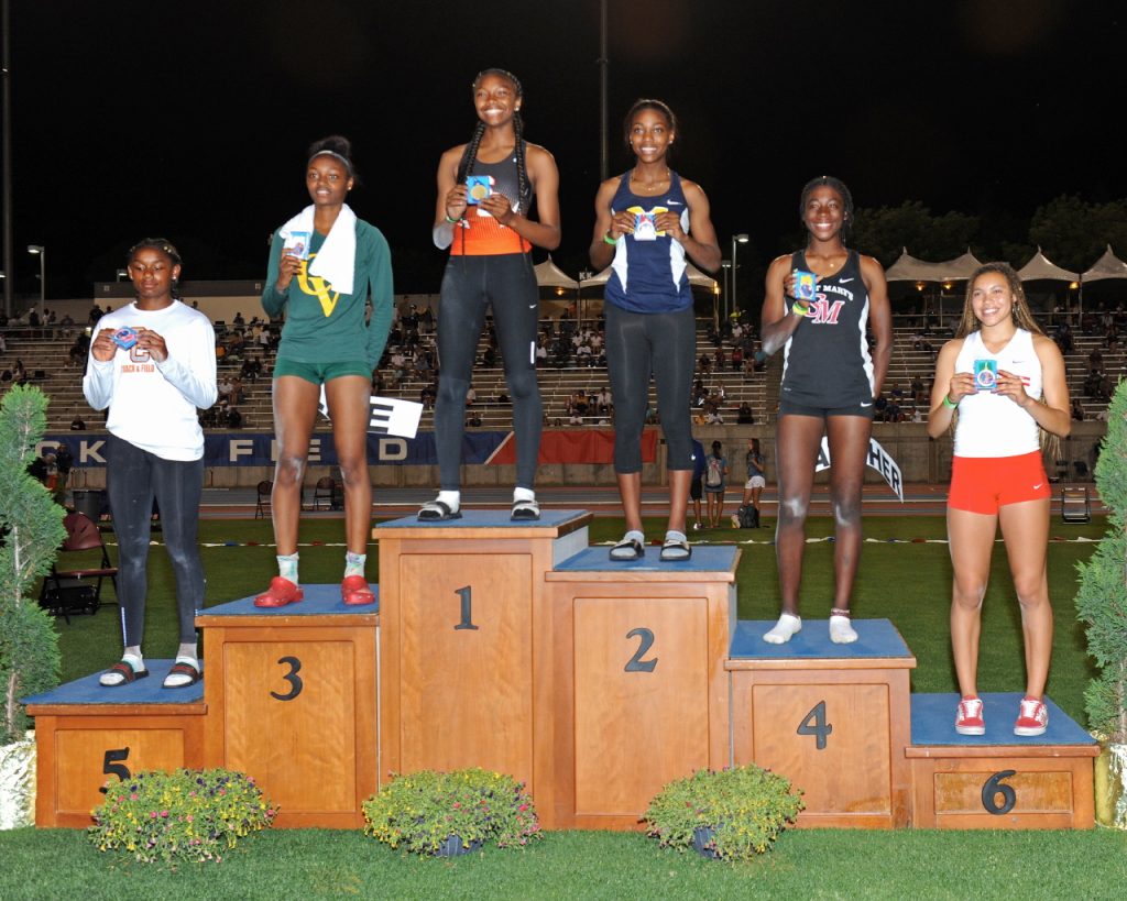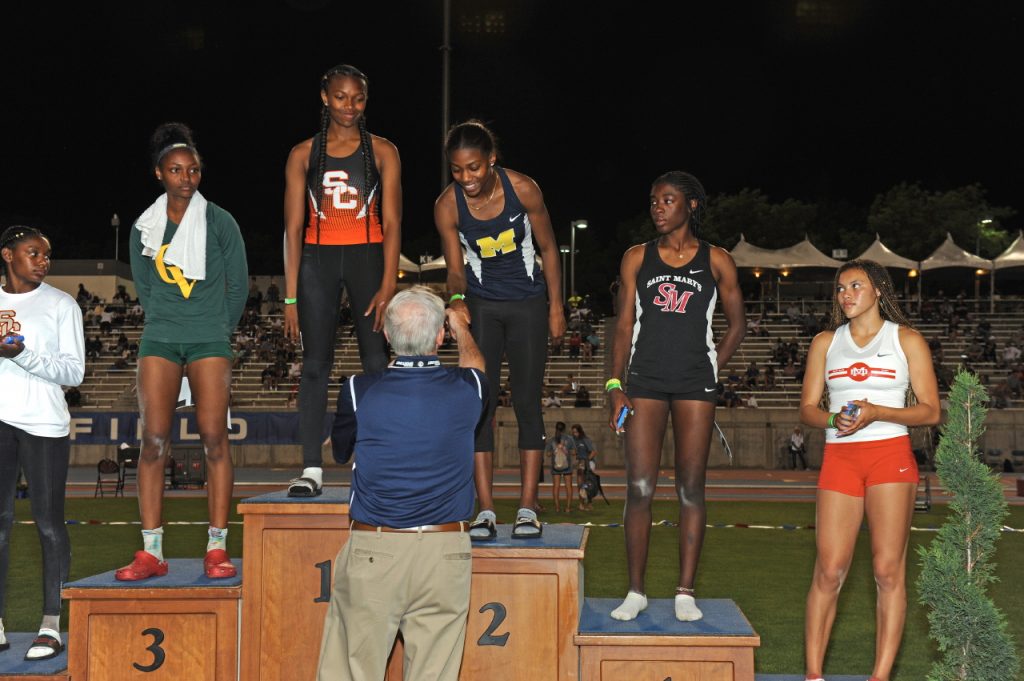 The Arcadia girls’ relay 4×100 placed fourth in the prelims with Junipero Serra High School posting the best time of the evening at 45.74. Arcadia’s Stephanie Yen also moved forward with her jump of 18-01.25 in the long jump and Muir’s Micah Fulton, who stood on the podium last year to accept fourth place in the triple jump with a 44-4.75 jump, qualified third in the prelims in the same event with a jump of 40-08.00. However, she did not post a qualifying long jump.