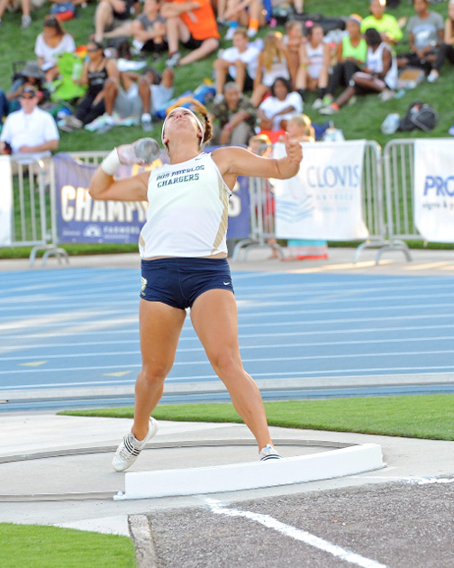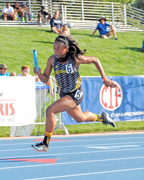 The boys’ state championship title was won my Mater Dei (ss) with the assistance of sprinter Curtis Godin who won both the 100m (10.31) and the 200m (20.87). The spectators were obviously impressed by his speed and grace when he beat De La Salle (NC) who leaned in for a second place slot (13.68) followed by Simi Valley’s (ss) Alex Billing (14.01). The boys’ 4 x 100 relay was won by the Woodcreek team of Alex Rotteveel, Tyus Williamson, Aspyn Walton and Colton George (sj) (41.20).