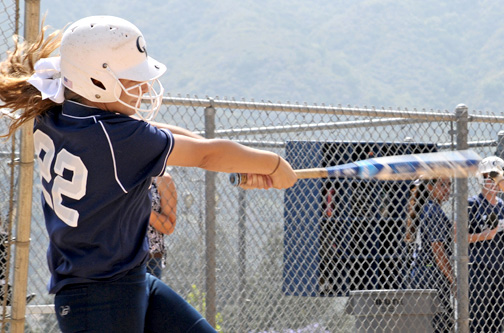 Bat Girl: Hailey Cookson hits her second home run of the game in a CIF wild card playoff game against Sonora on May. 19. The Lady Falcons won 6-3.  Photographer Dan Holm