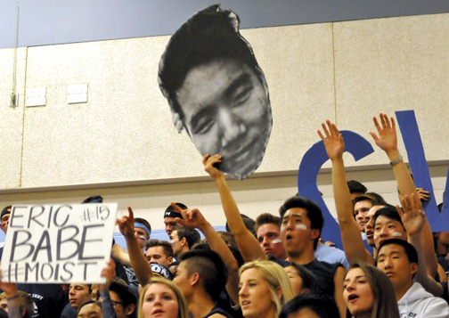 Don’t Get a Big Head: CVHS basketball fans and students had a good time Jan. 24 as their Falcons defeated rival Arcadia, 64-54, especially those holding signs and cutouts of senior guard Eric Bae. Photographer Jason Ballard