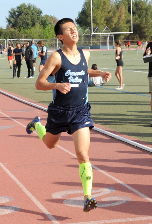 Flying on the Field: Falcon Nick Beatty crossing the finish line of the 800m at the season’s second tri meet against Glendale and Pasadena high schools.