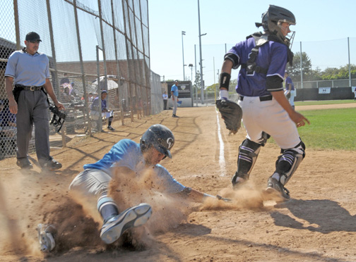 Freshman catcher Kewin Ledesma slides home on a sacrifice fly against the Hoover Tornadoes on May 13. CV won 5-0. Photographer Dan Holm