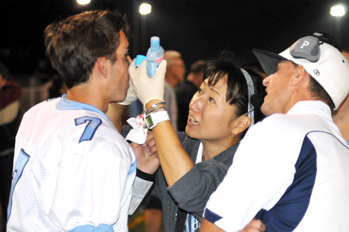 Hold Still, this Might Sting: CVHS trainer Junko Nakayama tends to quarterback Brian Gadsby as Coach Paul Schilling looks on during a Sept. 20 game against La Cañada. Gadsby cut his mouth badly being tackled moments earlier and would sit out the second half, but CV prevailed 42-14.  Photographer Jason Ballard