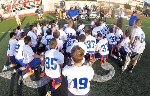 Rosemont flag football coach Jim Mustain addresses his team on Feb. 20 after the Spartans defeated Roosevelt to claim a share of their second straight league championship.  Photographer Dan Holm