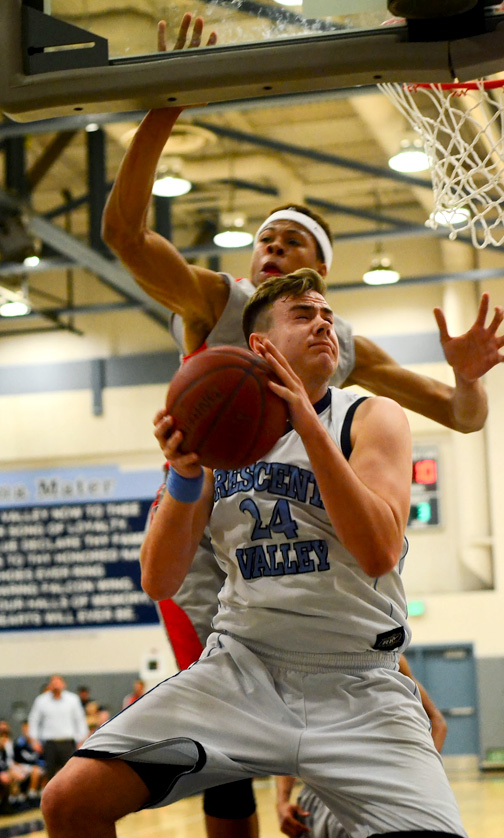 Sweet Moves: Senior center Eric Patten tries for a reverse layup in a win over Pasadena on Feb. 7. Patton was named co-MVP of the Pacific League and helped lead the Falcons to a share of the league championship, the program’s first since 2004. Photographer