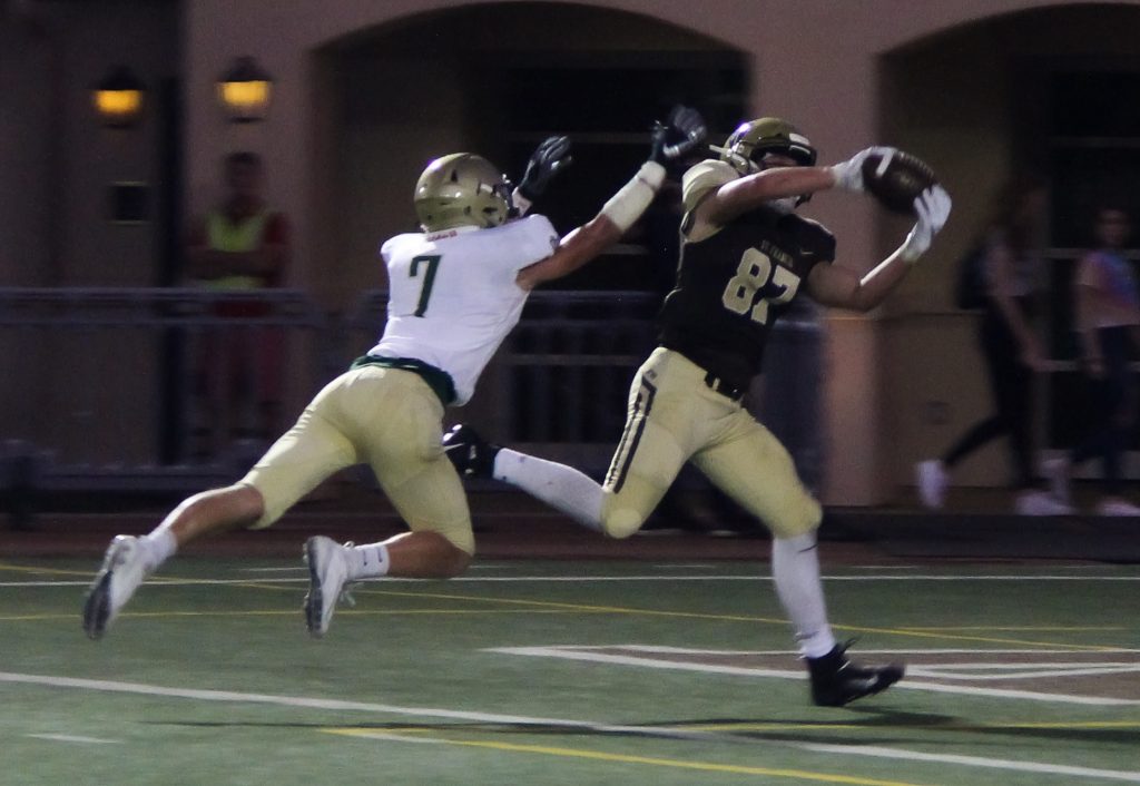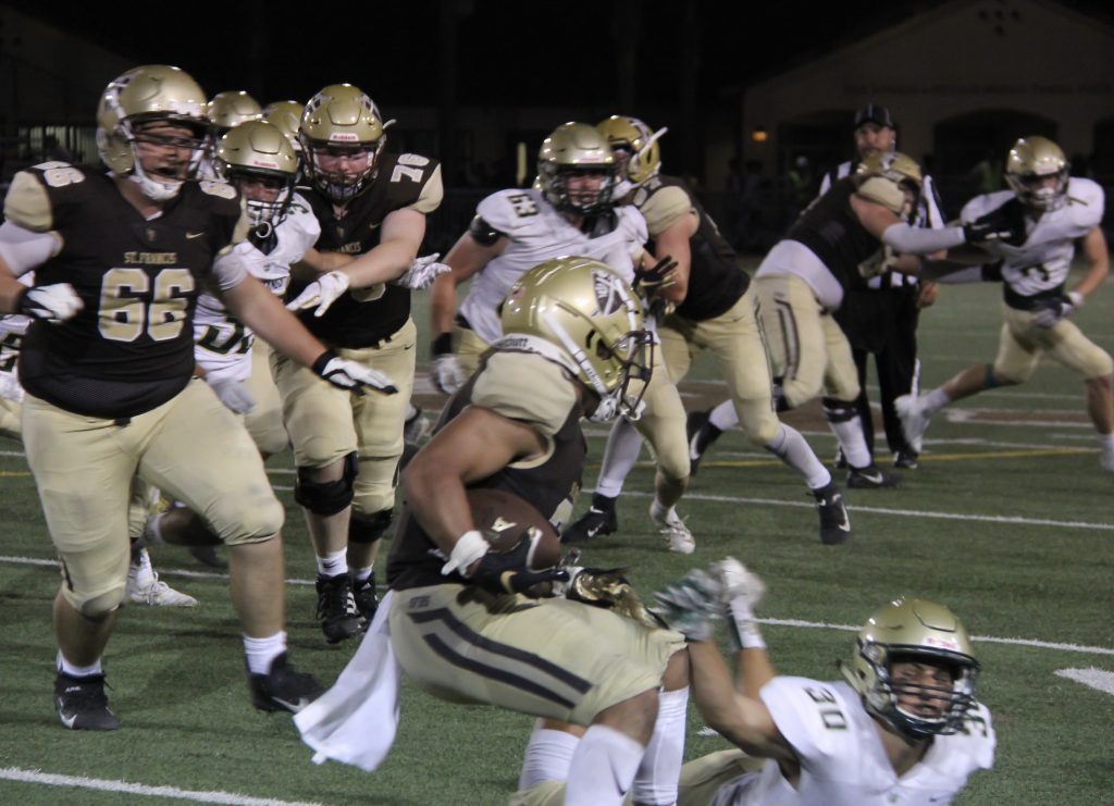 As the 2019 St. Francis football season started, so did many questions on how new starting quarterback Jack Clougherty was going to perform in his varsity debut. Though experienced, the Golden Knights were nervous as was evident in the first couple of drives when they weren’t able to advance. The defense wasn’t able to stop Mira Costa’s poised offense as the Mustangs scored early in the first quarter to make it 7-0. After the pregame jitters and nervousness wore off, the Golden Knights were able to establish their run and pass game in the second quarter.