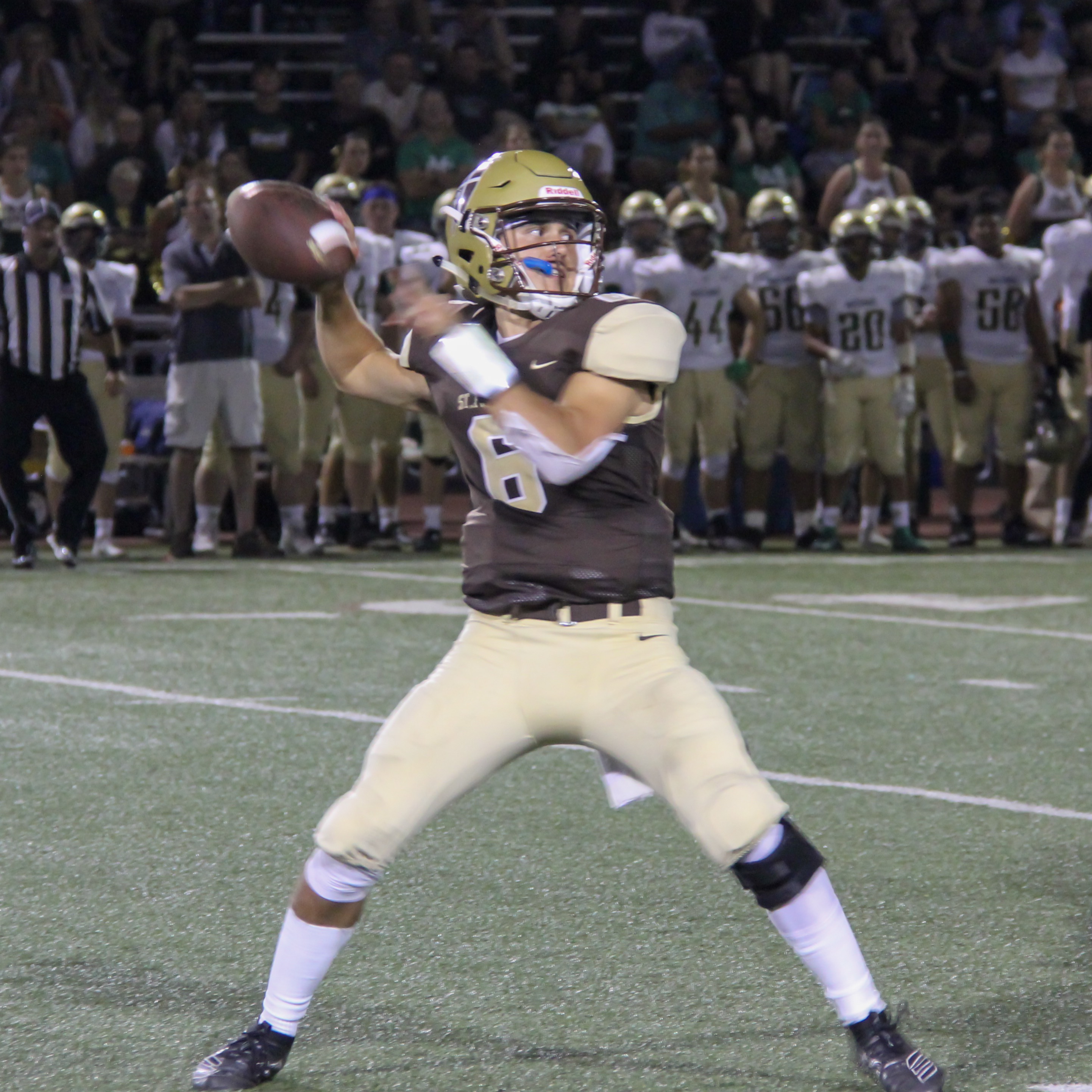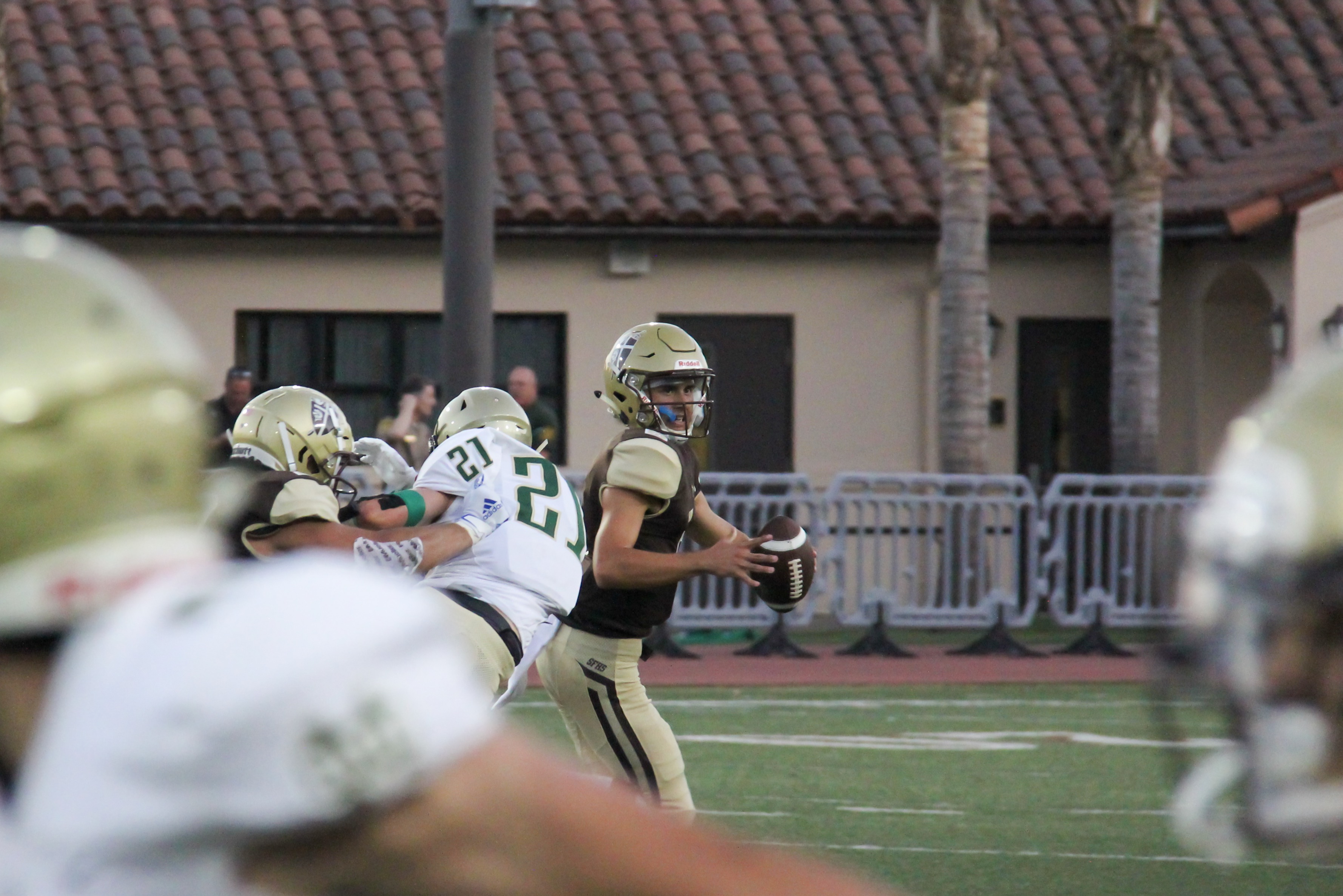 As the 2019 St. Francis football season started, so did many questions on how new starting quarterback Jack Clougherty was going to perform in his varsity debut. Though experienced, the Golden Knights were nervous as was evident in the first couple of drives when they weren’t able to advance. The defense wasn’t able to stop Mira Costa’s poised offense as the Mustangs scored early in the first quarter to make it 7-0. After the pregame jitters and nervousness wore off, the Golden Knights were able to establish their run and pass game in the second quarter.