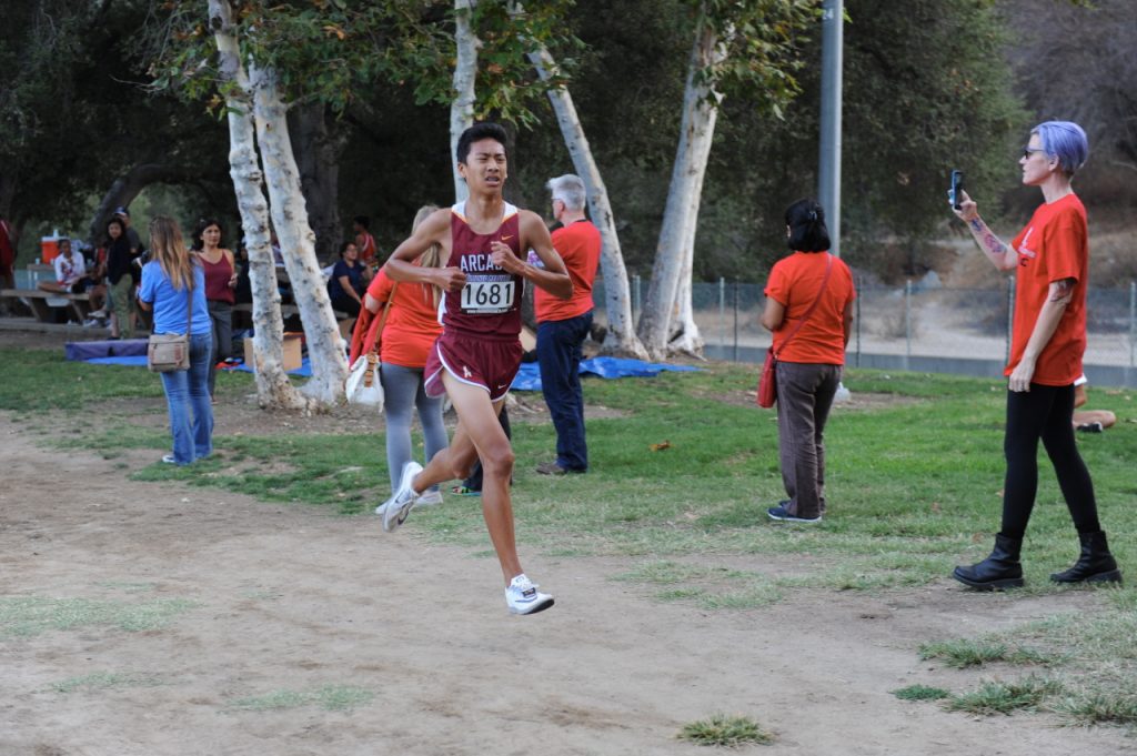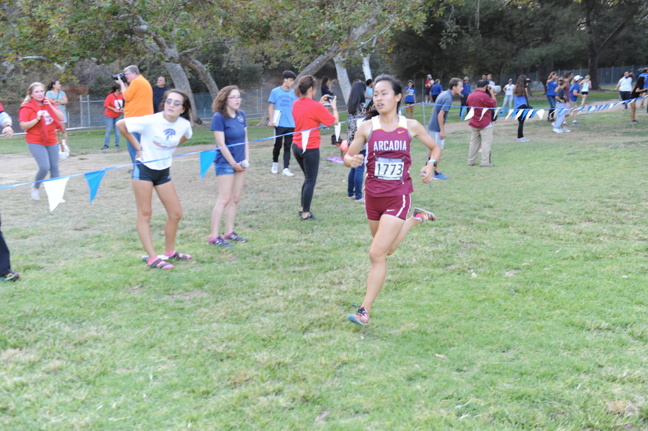 The Falcon girls’ varsity team set an exciting tone to their race as CV’s front runner Sophia Atin commanded the lead at the bridge through the first and second miles of the course. Arcadia’s top runner, senior Joyce Wu, held to her personal strategy, “follow throughout the course and make a move in the final loop,” to take the lead just before the final loop to earn the win running 19:17.8. She was followed by CV’s Atin (19:23.0).