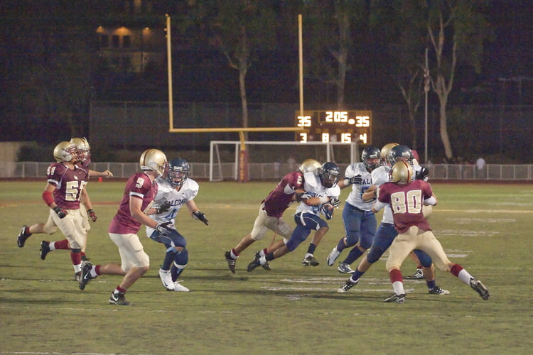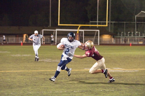Despite it raining – raining ref’s flags that is – onto the field on Friday evening, the CV Falcons were able to mark a notch on the ‘win’ side of their helmet after taking on the La Cañada Spartans at their home field. CV fans, who were still reeling over the previous week’s contest against the Golden Knights, soon had their attention drawn to the Spartans field where the action was riveting, if not interrupted.