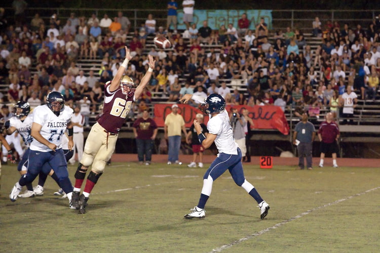 over his head »La Cañada’s David Miller reaches for the sky but can’t block the Falcon pass.