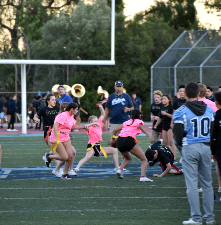 The evening started with a parade of the school groups that participated, including students from many of the athletic programs and performance arts. Following the parade, the senior and junior female members of the pep squad participated in a powder puff football game. The seniors ended up keeping the juniors scoreless, winning 24-0.