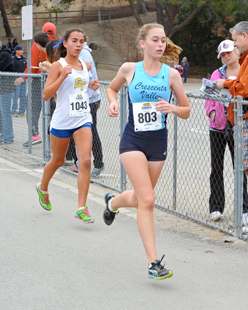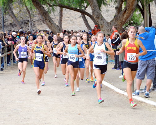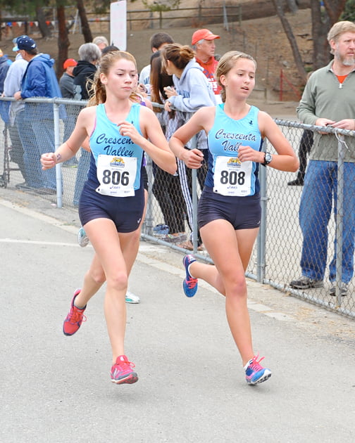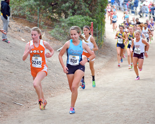 The CV Falcon girls, led by Megan Melnyk, had to again battle rival Arcadia in Race 3 at the prelims. Arcadia’s lead runner Roni Yamane put some distance between her and her competitors from the start. Coming down Reservoir Hill towards the finish, Yamane was being chased by Capistrano Valley’s Grace Schafer, who managed to overcome her on the airstrip to take first (17:37). Yamane placed second (17:52).