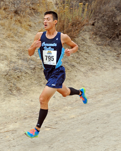 Falcon Gabe Collision and teammate Nick Beatty took off with lead Arcadia runners clocking in the first 400 in 63 seconds. No surprise that Apaches Philip Rocha, Jarrick Wenslow and Josue Gonzalez were at their sides as they climbed the first switchback heading up the mountain. Falcon senior Beatty made his move on the downhill section to lead the pack to the next series of mountains appropriately called Poop-out Hill.