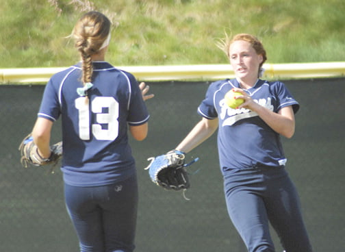16__Elissa-Arnold Hannah Cookson catches a fly ball to center as her sister, Hailey, assists. Crescenta Valley HS vs Pasadena HS softball