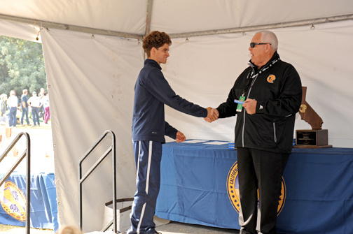 As the runners completed the far loop, they returned to the 2.1-mile mark leading back to the finish line. The front nine runners were clustered closely with FitzGerald keeping contact from the back. In the last mile, FitzGerald began to pick off his competition earlier than had been seen in other races until it became the final three: El Camino Real’s Justin Hazell, Falcon Colin FitzGerald and E. Roosevelt’s Tyler Spenser. Hazell responded quickly to FitzGerald’s challenge in the last 800m. Separating himself from the other two, Hazell reached the final 100m, driving hard to the finish line and winning with a time of 15:03.8. As FitzGerald and Spenser reached the green, there was an attempt by Spenser to get ahead, but FitzGerald shut it down with a burst of speed and continued to dive ahead, crossing the finish line to place second running 15:10.1, followed by Spenser (15:11.8). Matt Strangio from Jesuit placed fourth running 15:15.5.