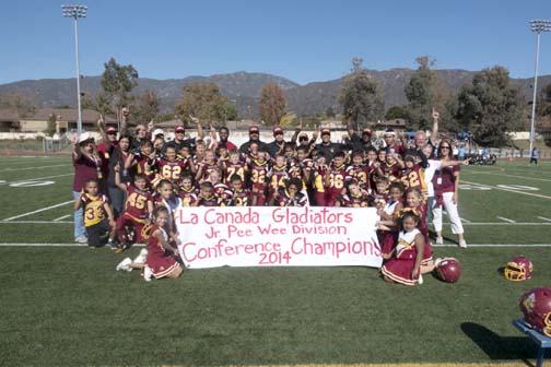 On Sunday morning, Nov. 23, at Duarte High School the La Canada Gladiators defeated the previously undefeated Pasadena Panthers 20-7 and were crowned Champions of the San Gabriel Valley Jr. All American Football Conference. The Gladiators finished the season with a record of 9-1, their only defeat coming earlier this season to the same Pasadena Panther team. This is the second consecutive Conference Championship for this Gladiator team. Last year, the squad went undefeated and was the Gremlin Conference Champions. Over the last two years they have a record of 19-1.