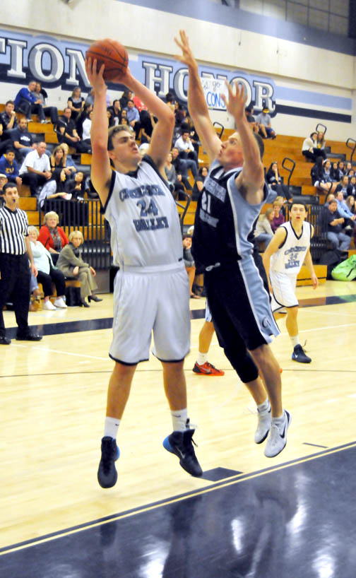 Eric Patten goes up against CV alum Matt Oliver in the Nov. 27 alumni game. The varsity lost to he alumni 69-64.
